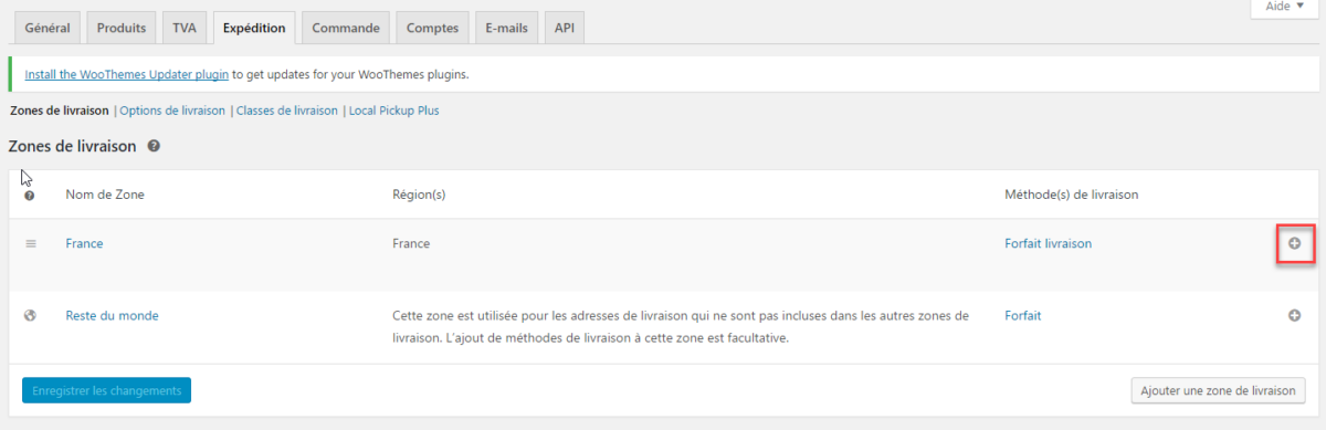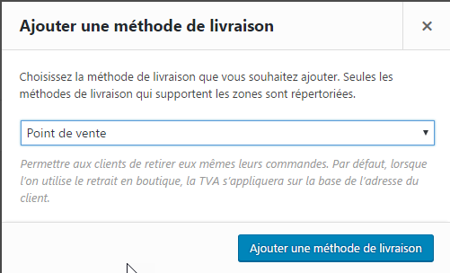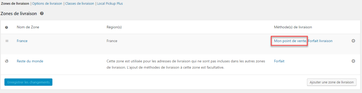 Les points de retrait/vente (pickup) par défaut de WooCommerce se présentent comme suit : on les ajoute dans WooCommerce > Réglages > Expédition > Zones de livraison > en cliquant sur le (+) à droite dans une ligne de zone de livraison.