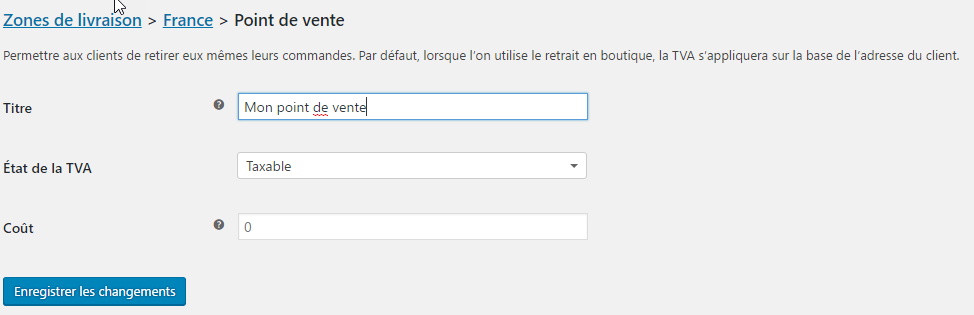 Les options sont : Taxable ou non, et coût (prix ajouté à la commande si le client sélectionne ce point de retrait, équivalent aux frais de livraison).