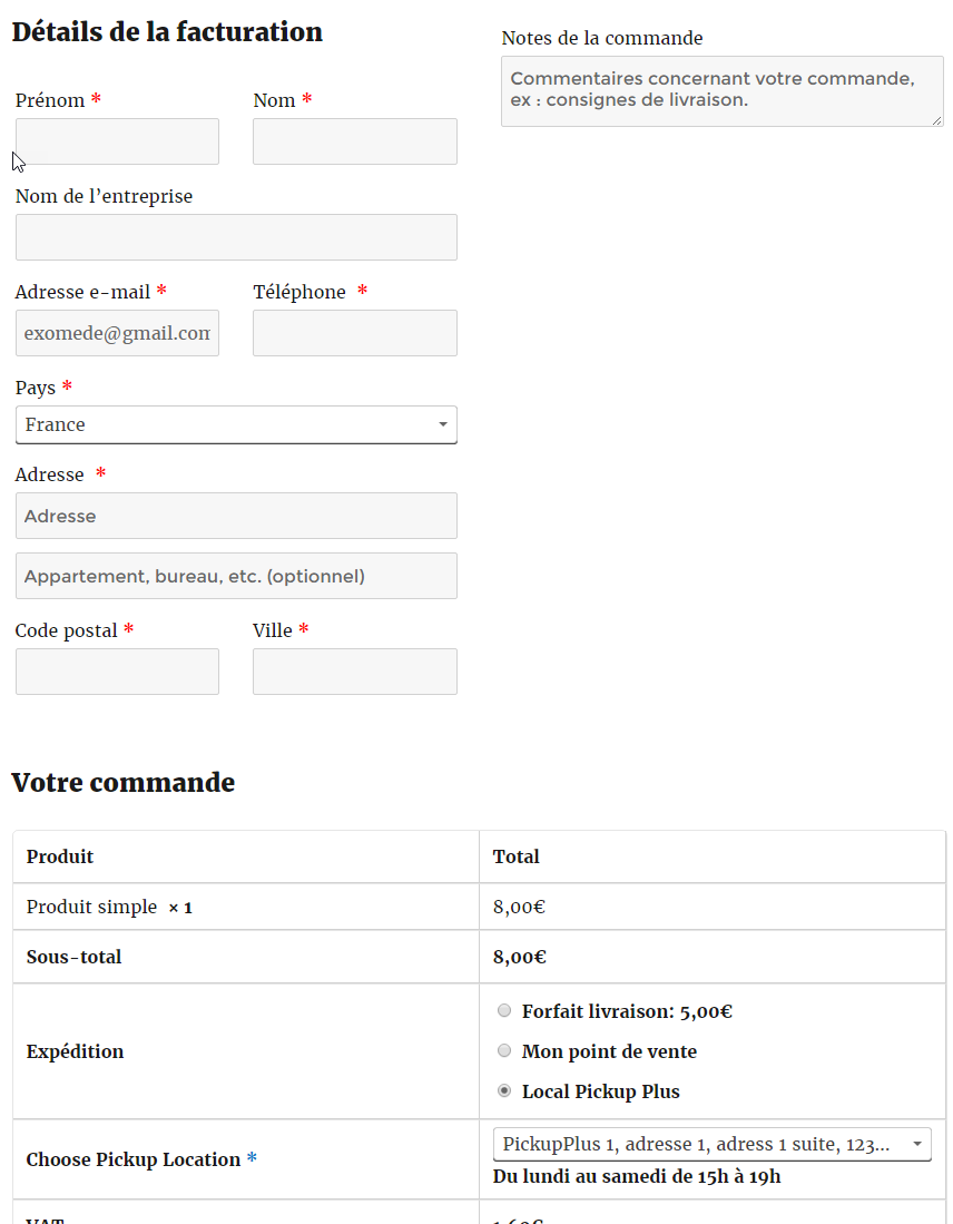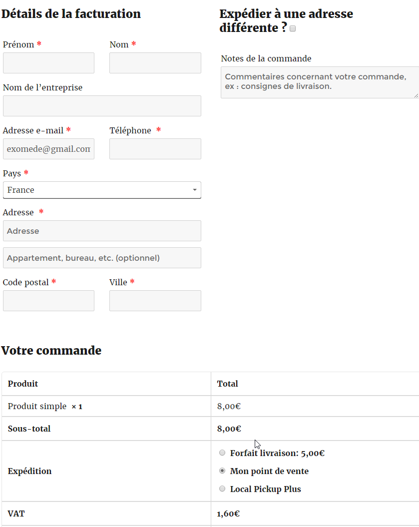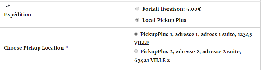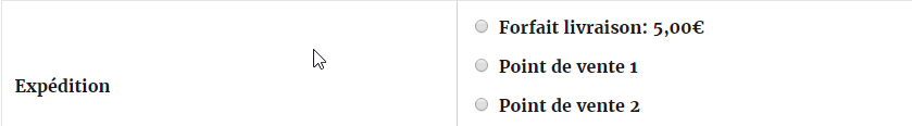 Exemple : en créant un forfait de livraison à 5€ ainsi que deux points de vente gratuits appelés « Point de vente 1 » et « Point de vente 2 », on obtient ceci lors de la commande :
